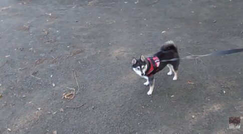 いつもの散歩道、なぜかももの足が止まります。 辺りを見回し、不安そうな心配顔。 「どうした? もも」 ももはまた足を止め、遠くを見つめて動きません。 「もも大丈夫だよ。」